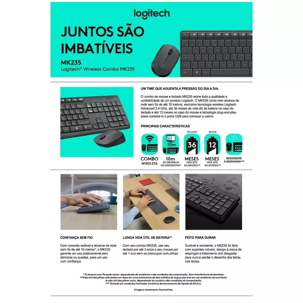 Não se preocupe mais com possíveis acidentes líquidos durante o uso do teclado, pois o Logitech MK235 é resistente a respingos, garantindo maior durabilidade e fácil limpeza. Além disso, as pilhas dos teclado e mouse possuem longa duração, proporcionando meses de uso sem a necessidade de troca constante, ideal para quem busca conveniência e economia.